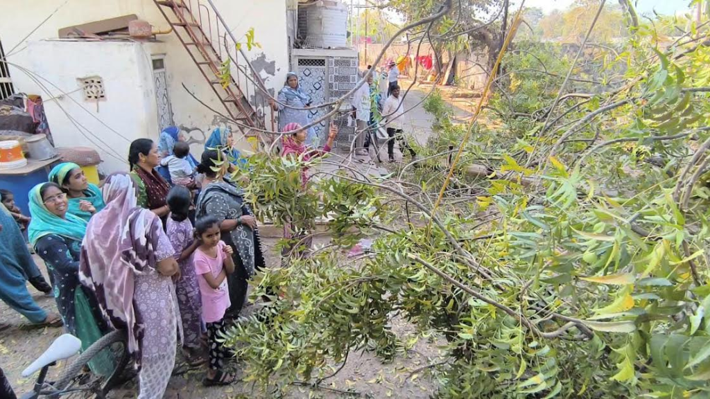 દરમિયાન શનિવારના રોજ બિલ્ડીંગનો ઉપરનો ભાગ બાજુમાં આવેલી સોસાયટી તરફ નમી પડયો હતો. આ ઘટનાને કારણે સોસાયટીના માર્ગો બ્લોક થઈ ગયા હતા અને અનેક વૃક્ષો ધરાશાયી થયા હતા.બિલ્ડીંગનો કાટમાળ વીજ થાંભલાઓ પર પડતા સમગ્ર વિસ્તારનો વીજ પુરવઠો ખોરવાઈ ગયો હતો. દુર્ઘટના સમયે એક વાહનચાલક નીચે દટાયો હતો, જેને સ્થાનિકોએ સહીસલામત બહાર કાઢતા મોટી જાનહાનિ ટળી હતી. ઘટના બાદ પીજીવીસીએલ અને આરએમબી વિભાગની ટીમો તાત્કાલિક સ્થળ પર દોડી ગઈ હતી. કોન્ટ્રાક્ટ એજન્સીના અધિકારીઓએ સ્થળ મુલાકાત લઈ પરિસ્થિતિનો તાગ મેળવ્યો હતો અને વીજ પુરવઠો યથાવત કરવાની કામગીરી હાથ ધરી હતી.